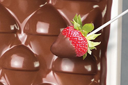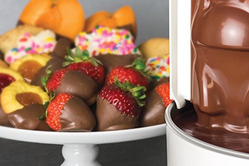 The Nostalgia CWF48WT chocolate fondue Waterfall has a 3 pound Capacity and creates a wall of a decadent chocolate that delivers a touch of elegance to any occasion. It features an auger that delivers the chocolate to the top of the Waterfall, then flows and is ready to be paired by dipping fruit pieces, breads, pretzels, and more under the flowing chocolate Waterfall . The simple turn-dial control, operates the motor and the heated base, which keeps the chocolate flowing. Use dark, semi-sweet, milk, White chocolate and even liqueurs.Feature