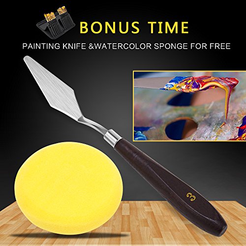 - BINGO - BONUS TIME - A carry case with pop-up stand which lets you easily swap out brushes while you work. With the carry case can also be folded shut and put safely in your backpack or carry bag in your trip. Other than that, professional MIXING KNIFE And ART SPONGE for FREE too, which make painting with more ease