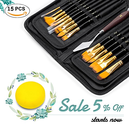 Yimaler 15Pcs Art Paint Brush Set Painting Brushes Kit with FREE Painting Knife & Watercolor Sponge Professional Paintbrushes Set with Synthetic Nylon Tips - Wood Handles for Body Paint Acrylics & Oil