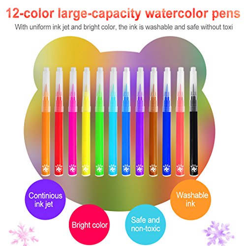- ❤【Easy to Use and Wash】12-color large-capacity watercolor pens, with uniform inkjet and bright color, and the ink is washable and safe, which can be washable and easy to scrub, children can spray freely and parents no need to worry.