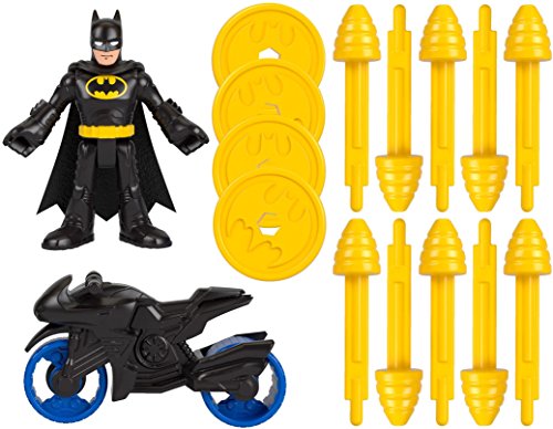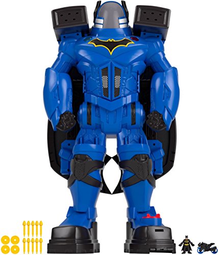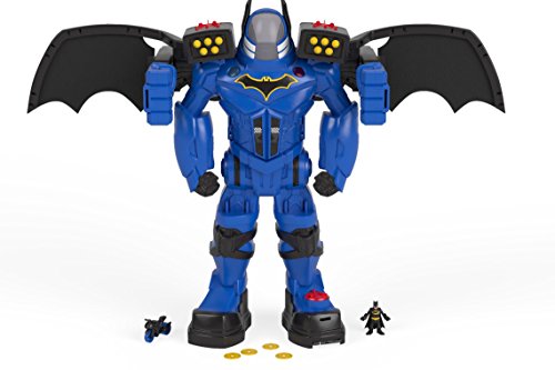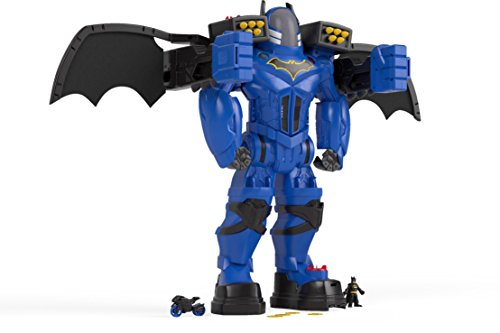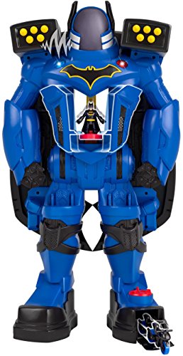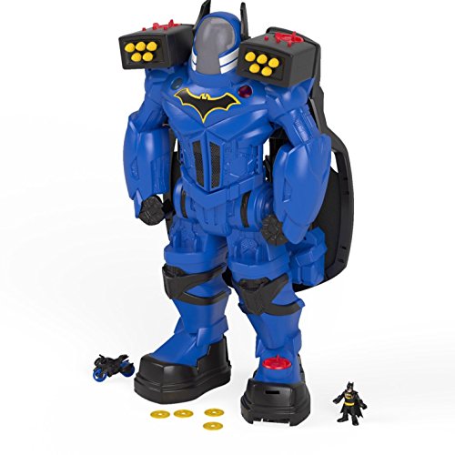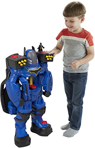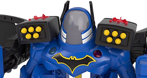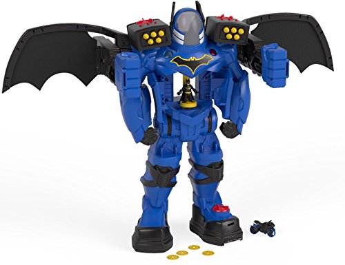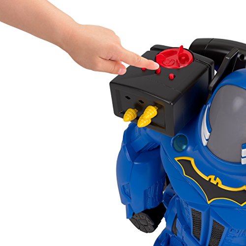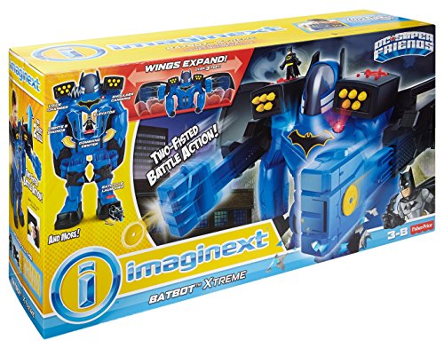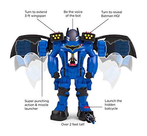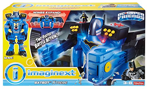 The Imaginext DC Super Friends Batbot Xtreme is the ultimate toy for Batman fans. With extendable wings, multiple projectile launchers, a hidden Batcycle, a voice changer, and real punching fists, your young Super Hero will have a blast defending Gotham City from all sorts of evil Super-Villain attacks! At over two-feet tall, the Batbot Xtreme towers over the enemies of Gotham City. With the turn of a Power Pad, kids send the robot into battle mode, extending its wings and arms and preparing for action. POW! Squeeze the triggers on the back of the Batbot to give those bad guys a super-charged, one-two punch! Turn the Power Pad on the robot's left shoulder to open the chest to reveal the hidden elevator that will take Batman up to the cockpit, where he can launch a counterattack. 3…2…1…FIRE! Press the launch buttons on the robot's shoulders to fire projectiles. Kids can add their unique voice to the Batbot Xtreme with the super cool voice changer—Haha! Take that, Super-Villains! For even more action-packed fun, turn another Power Pad to reveal the hidden Batcycle. Now your young Super Hero can send Batman racing into battle! Get kids' imaginations soaring with the Imaginext DC Super Friends Batbot Xtreme. Imaginext Imagine What's Next! Where development comes into play: Cognitive: Imaginative play and storytelling helps develop kids' language skills and can foster an early love of reading.Feature