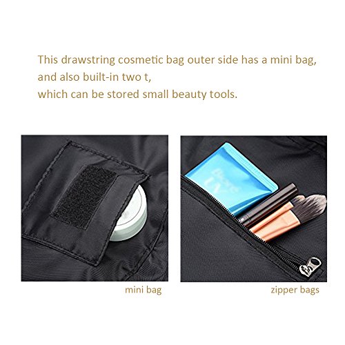 - This drawstring cosmetic bag outer side has a mini bag, and also built-in two zipper bags, which can be stored small beauty tools.