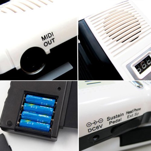 - Feature : NOW WITH SUSTAIN PEDAL! Full Size 61 Standard Keys (C2-C7) 5 Octave + 1 Key Keyboard with Standard MIDI Out - 16 Output Channel Design / Features 128 Tone Reportoire, 100 Background Rhythms, 20 Demo Tunes and 16-note Polyphony / Built in Speaker with Digital Volume Control; Plug in Jack for headphones or External Speakers or Amplifiers / Roll it up and put it inside the included pouch for easy storage or travel with ease with this 2 lbs piano / Can be operated 4 AA Batteries - not included (12 - 15 hours run time) or the included AC Adapter (Updated 11/18/2013)