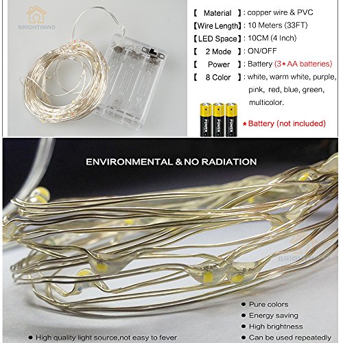 - 【3AA Battery Powered (not include) LED lights string is 33ft(10 meters)】 contains 100LEDs. Many colors to choose, make everywhere is full of warm and romantic atmosphere.