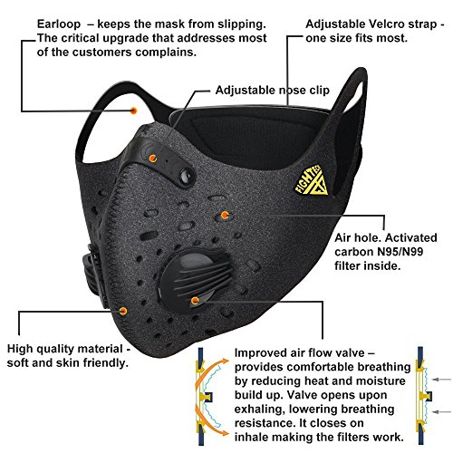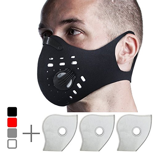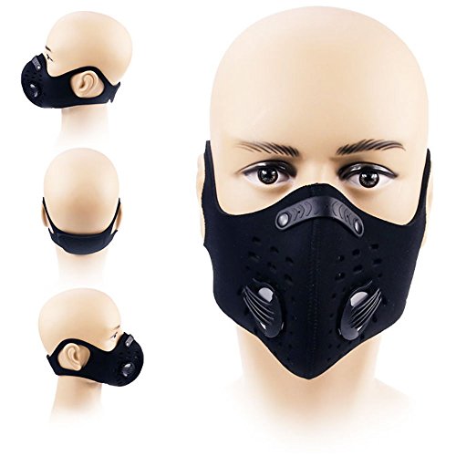 Anti Pollution Dust Mask with Valves and 3 EXTRA Activated Carbon N99 Filters. Filtration of Exhaust Gas Pollen Allergy PM2.5 Training Face Mask for Circling & Outdoor Activities by FIGHTECH (BLACK)
