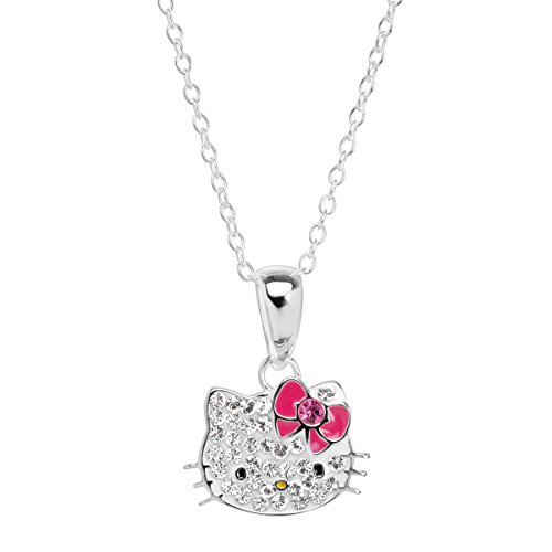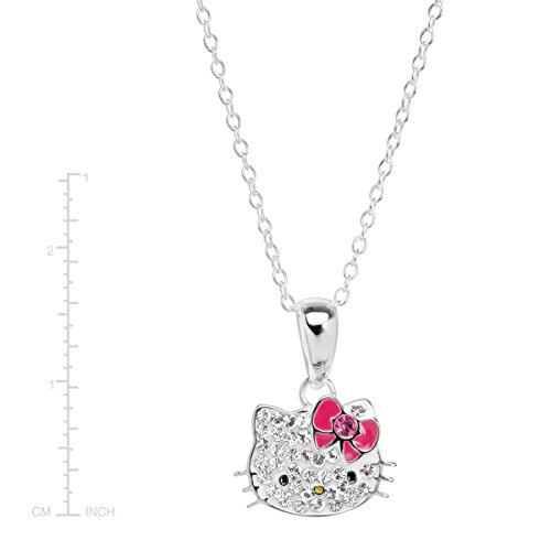 Bring your favorite character to life with this sparkling pendant! Hello Kitty is crafted in sterling silver with round-cut white crystals on the face and a pink crystal accenting her bow. Piece measures 11/16 by 1/2 inches. Comes with a sterling silver 18-inch cable chain with a spring ring clasp.Feature