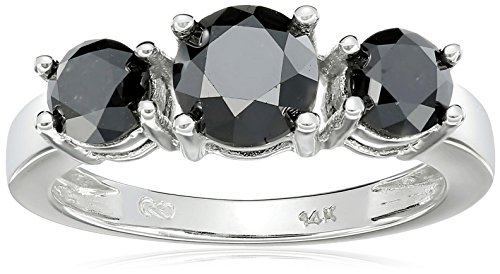 Radiant black diamonds make a dramatic statement, projecting sophistication and class. This three-stone ring holds three round black diamonds--a centerstone and two slightly smaller sidestones--which together have a combined weight of two carats. The diamonds are mounted in four-prong basket settings of lustrous and durable 14 karat white gold, and centered on a graceful white gold band. The contrast between the black diamonds and gleaming white gold is simply lovely.Feature