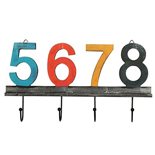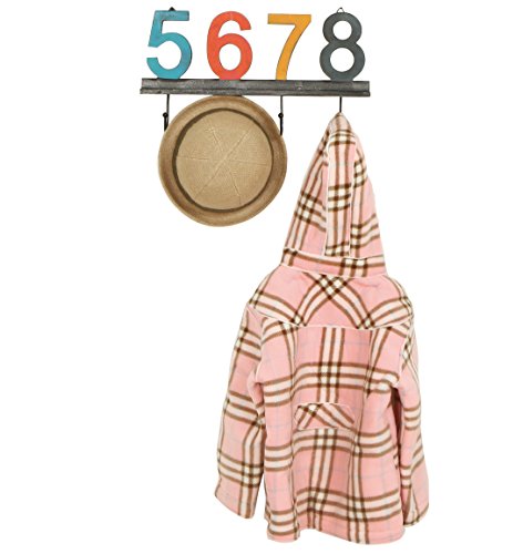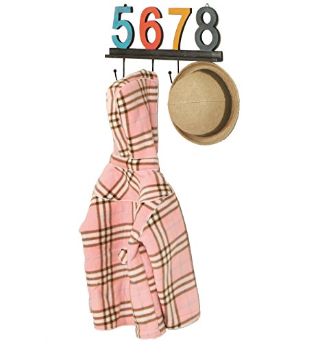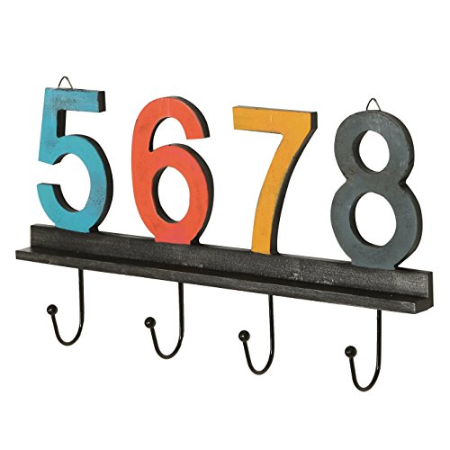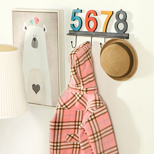 - Vintage-style wood coat rack rail with 4 hooks, colored numbers and distressed finish. Easily mounts on any wall.