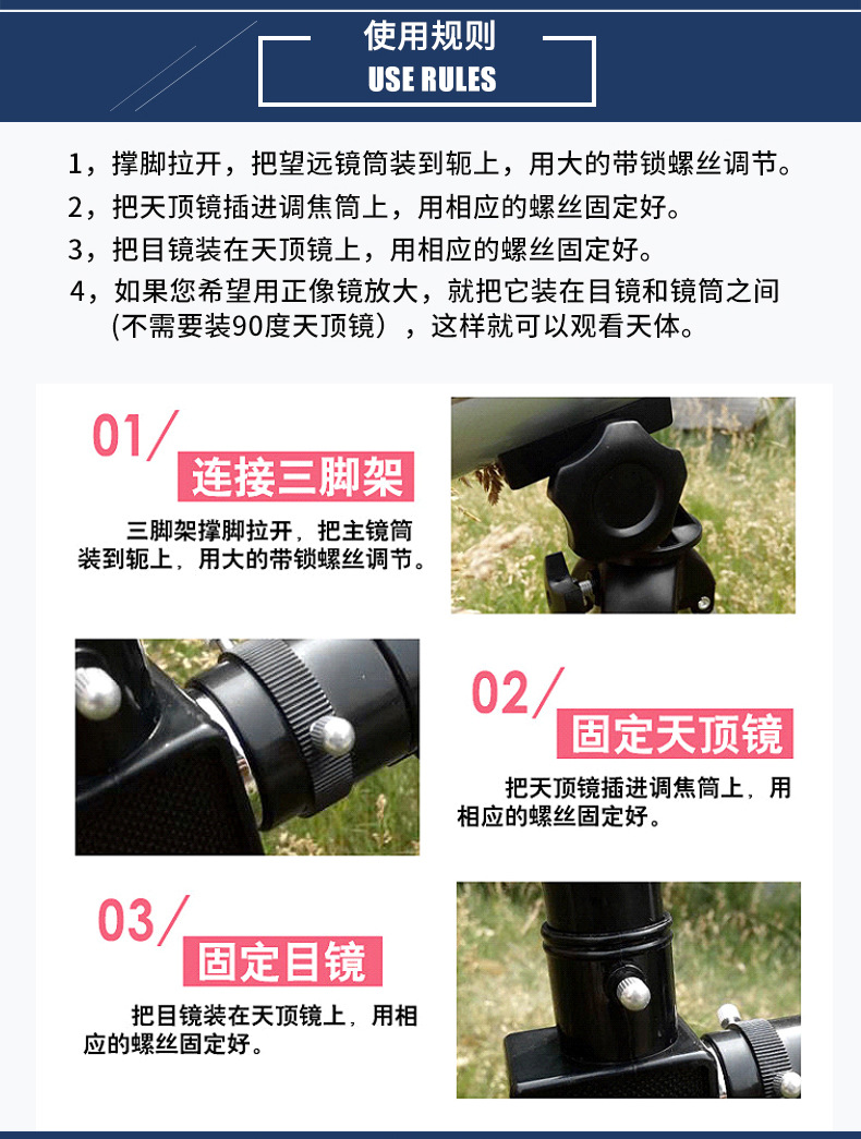 u0026nbsp;Terms of Use:1, feet opened, the telescope tube mounted on the yoke, with a large lock with a screw adjustment.2, the zenith lens into the focus on the cylinder, with the appropriate screws fixed.3, the eyepiece mounted on the zenith mirror, with the appropriate screws fixed.4, if you want to use the mirror as the magnifying, put it between the eyepiece and tube (do not need to install 90 degrees zenith), so you can watch the celestial bodies.