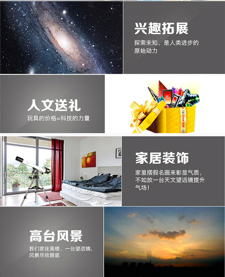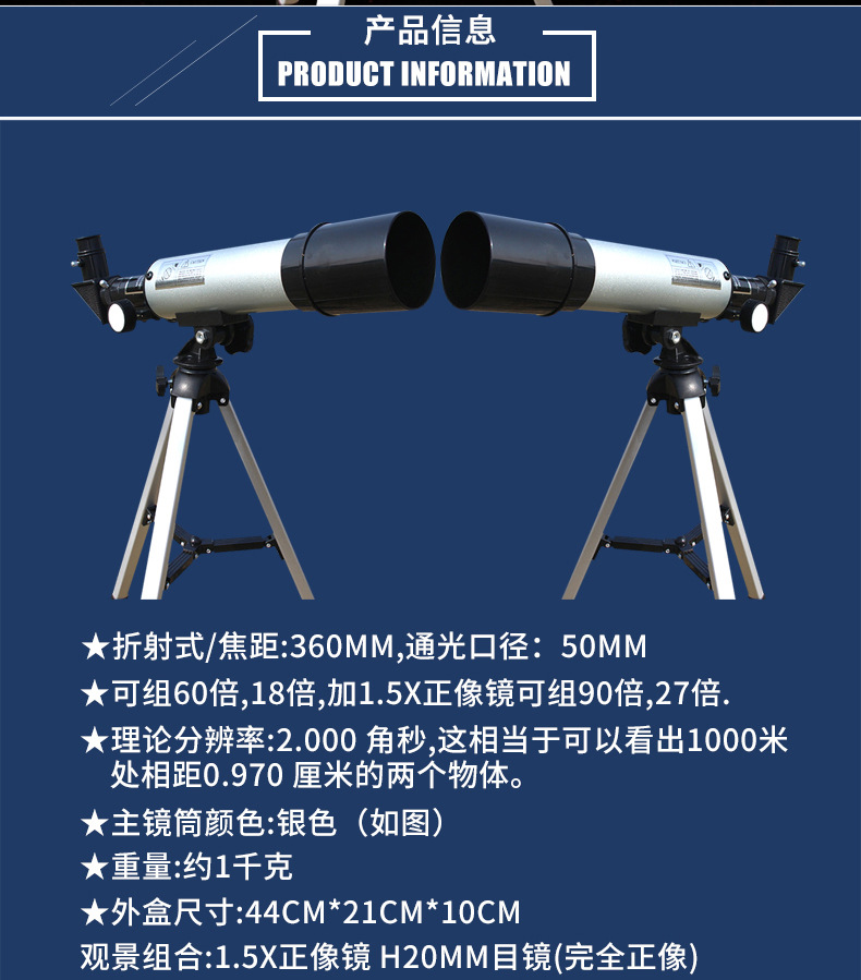main indicators:★ Refractive / focal length: 360mm, light diameter: 50mm★ can be grouped 60 times, 18 times, plus 1.5x mirror can be group 90 times, 27 times.★ theoretical resolution: 2.000 angle seconds, which is equivalent to 1000 meters away from the 0.970 cm distance between the two objects.★ main tube color: silver (pictured)★ Weight: about 1 kg★ box size: 44CM * 21CM * 10CM