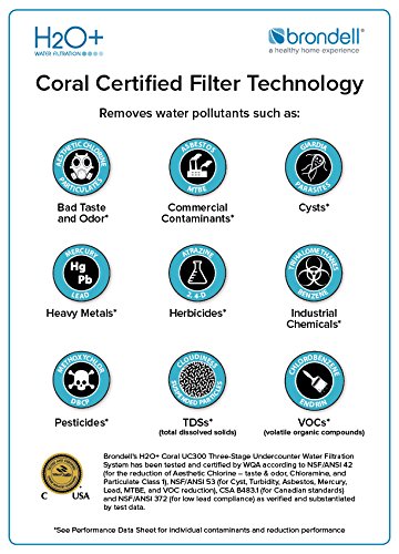 -. Feature : Replacement filter for the Coral Three-Stage UC300 under counter water filtration system / Reduces harmful Chloramine, Cysts, Mercury, Lead, MTBE, Asbestos, Turbidity, Class I Particulates, and VOCs / Twelve month filter life (600 gallon capacity) for the UC300 system / Double o-ring filter seal to prevent leaks & Twist & Seal filters make replacement a breeze / Gold Seal certified by WQA (Water Quality Association) for trusted performance