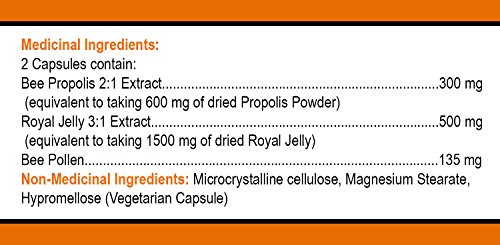 500 mg Royal Jelly, 300 mg propolis and 135 mg bee pollen in two capsules