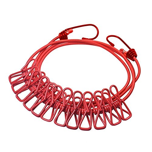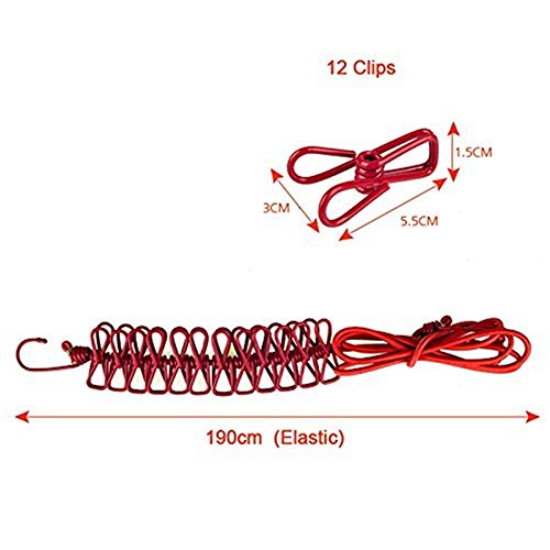 COJOY Portable Outdoor Travel Stretch Windproof Camping Clothesline Rope With 12 Clips (Red)