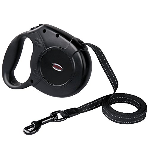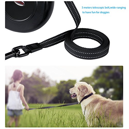 Instructions: The brake and lock button on the top of the leash lets you adjust the length of the leash as you need.Push the button down to lock the leash and click and button back to easily reel your dog back in.Enjoy your walk with your dog with full control and give them more freedom to wander, sniff,and poke around as they please. The retractable dog leash can expand up to 16.4ft,is strong and durable and made for daily use.The strong spring is great for smoothly retracting your dog leash without any harsh yanking. Press the button down and forward to stop the leash stretching,and temporarily control the dog. To restore the automatic extension of the leash,just pull the button back.