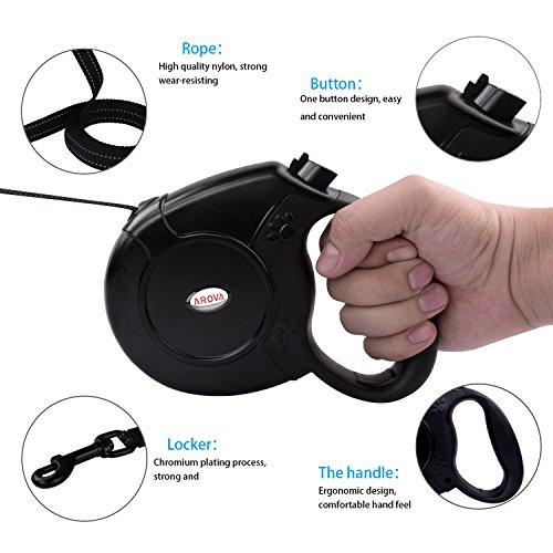 Studio : AROVA Publisher : AROVA Binding : Misc. Product Description Enjoy a freely walking time: Walk your dog freely in open area with the one-hand brake, release and recoiling system. When the button is released,the tough cord extends and your dog is free to wander up to 16.4ft away. Press the lock button and then pull backward the release button to limit the length of the leash and push the release button forward to easily draw your dog closer to you.