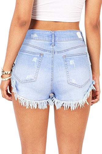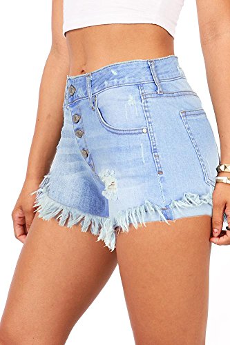 Classic high waisted shorts with distressing details and a heavily frayed hem. Traditional 5-pocket construction and button up fly closure.Feature