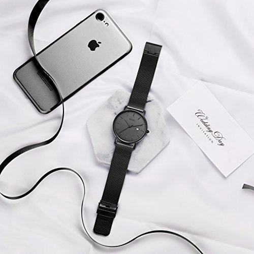 ♥30M waterproof black watch men with 316L stainless steel case and mesh bracelet.