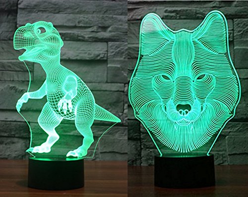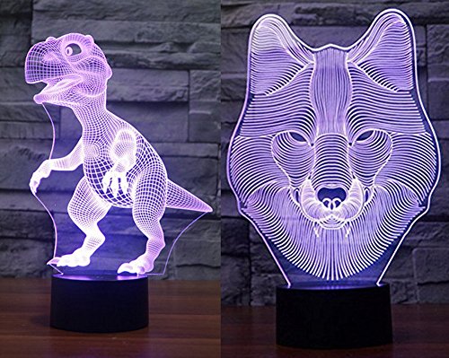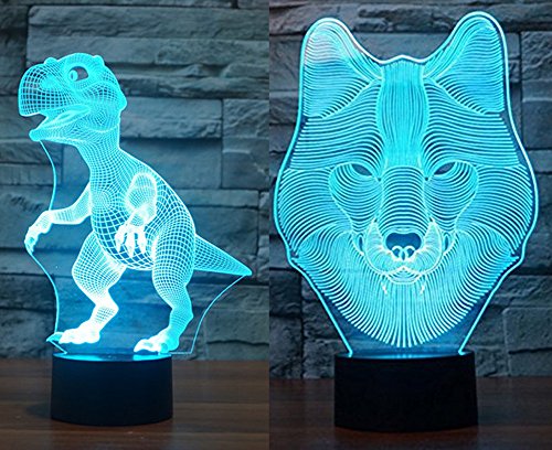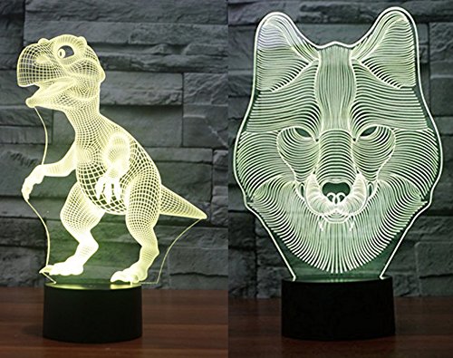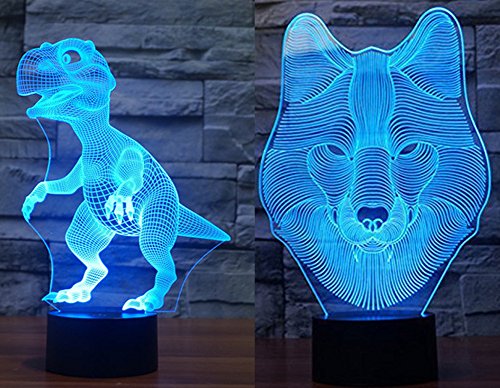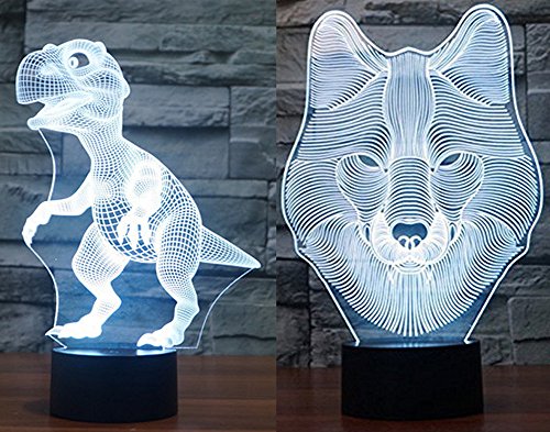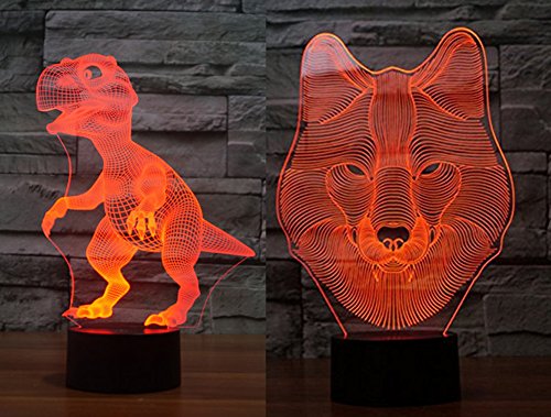 -. Feature : 2-in-1 Gift Set: Includes two plates and ONE base,1pcs of Dinosaur + 1pcs of Wolf 3D Desk Lamp. Fits any décor. Energy-efficient long-life LED bulbs are used to create a warm glow that won't overheat. Start enjoying your very own multicolored USB powered light today! / Exclusive Technology & Unique 3D Lighting: The playful product combines man-made fibers with natural materials and both machinery and artisan handwork. You will be shocked that this fashion and creative 3D Illusion Lamp turned out to be a 2D wire frame lamp which is only a few millimeters wide. Especially in the dark, visual stimulation will be very strong. It makes your room more interesting. / 7 Colors Change: Beautiful colors, Red, Green, Blue, Yellow, Cyan, Pink, White, Color Changing. / USB Powered & Long Lasting: Low consumption and long lifespan up to 10,000 hours. So convenient to take with you everywhere. / Perfect for displaying in bedroom, child room, living room, bar, shop, cafe, restaurant and more as decorative light or night light. Best gift for your kids, friends, relatives or your lovers on Birthday, Holidays, Christmas, etc.