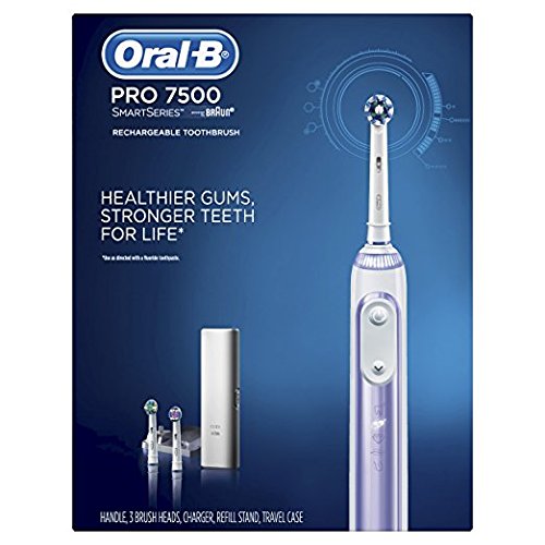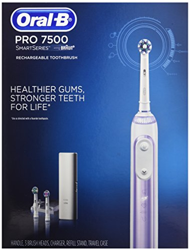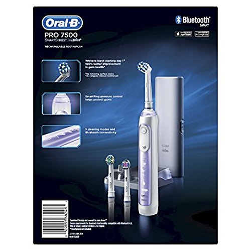 Studio : Procter Gamble - HABA Hub Publisher : Procter Gamble - HABA Hub Binding : Health and Beauty Product Description The Oral-B SmartSeries 7500 Power Rechargeable Electric toothbrush with Bluetooth connectivity gives you healthier gums, stronger teeth for life. Bluetooth communication allows the brush to connect with your smartphone to give you real-time feedback on your brushing habits. With 5 unique modes and a customizable SmartRing pressure sensor that lights up when you brush too hard, the Oral-B Pro 7500 will transform the way you brush. You can even customize the pressure sensor's color! Best of all it's brought to you by Oral-B - the #1 brand used by dentists worldwide. use as directed with a fluoride toothpaste 0