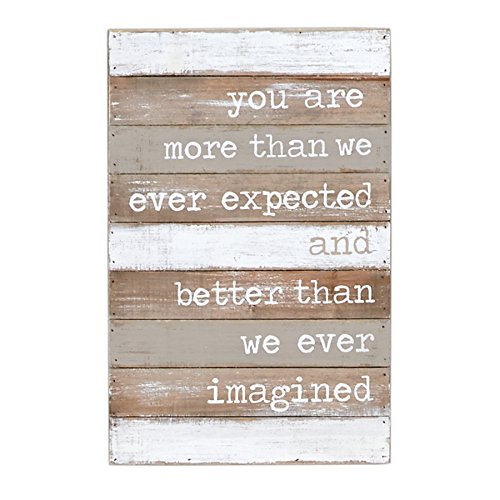 - Painted, distressed and planked shadow-box style wood plaque features printed "you are more than we ever expected and better than we ever imagined" sentiment.