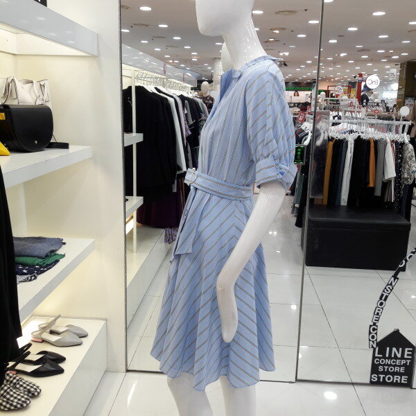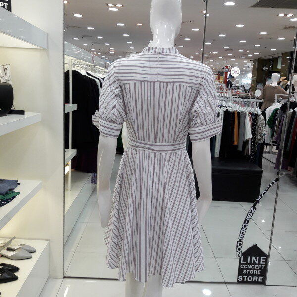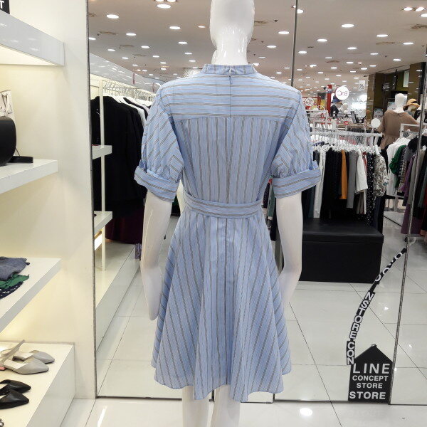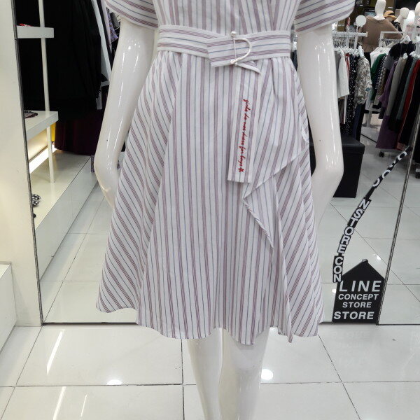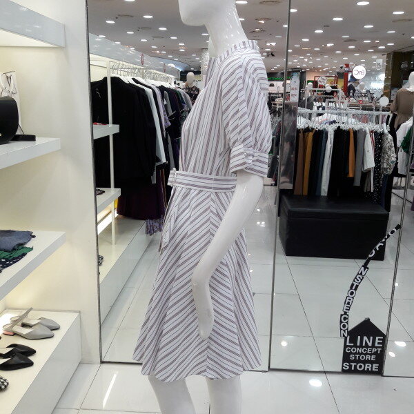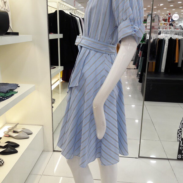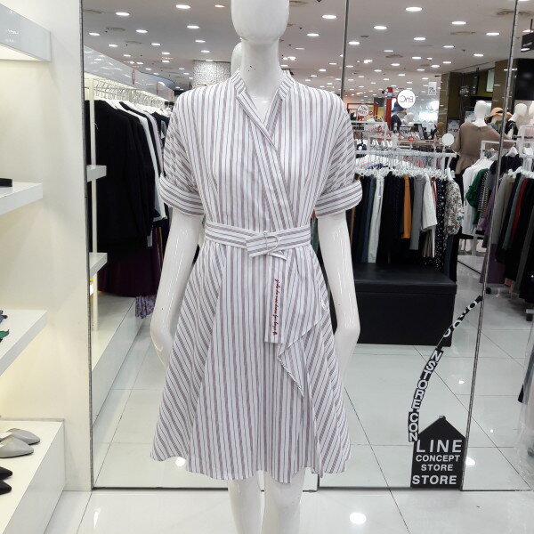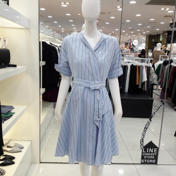 18년 가을 신상 가격인하된 네크라인이 예쁜 원피스입니다 전체 스트라이프 패턴으로 시원하고 화사하며 벨트로 허리라인을 잡아주어 여성스러운 스타일입니다 오피스룩 모임룩으로 추천합니다