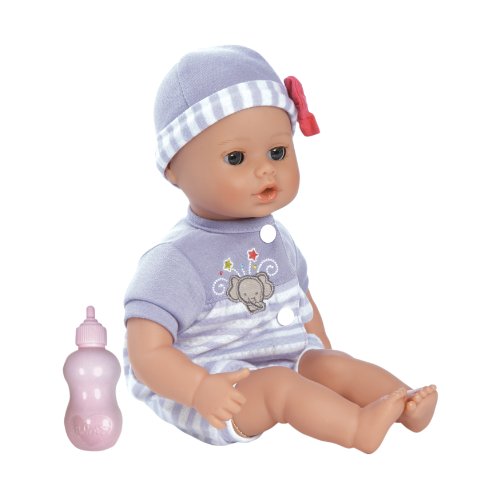 - Feature : Perfect "1st" baby doll at 13" Inch made of baby powder scented vinyl / Elephant Fun comes dressed in a striped onesie sleeper with embroidered elephant with light skin and blue eyes / 100% machine washable for good "clean" fun! / Comes with Adora feeding bottle and can suck it's thumb / Perfect toy for kids for ages 1+
