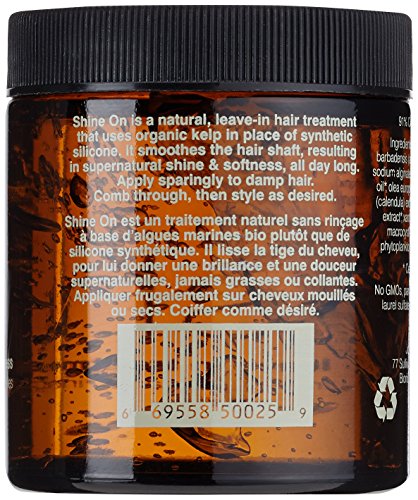 John Masters Organics shine on leave-in treatment for supernatural shine and softness natural, leave-in hair treatment uses organic kelp in place of synthetic silicone to smooth the hair shaft, leaving hair shiny and soft, all day long. John Masters Organics shine on leave-in treatment for supernatural shine and softness is a great natural-shine alternative to petroleum-based products. 6 additional certified-organic plant extracts in John Masters Organics shine on leave-in treatment for supernatural shine and softness help condition the hair. John Masters Organics shine on leave-in treatment for supernatural shine and softness is safe for color-treated hair.Feature