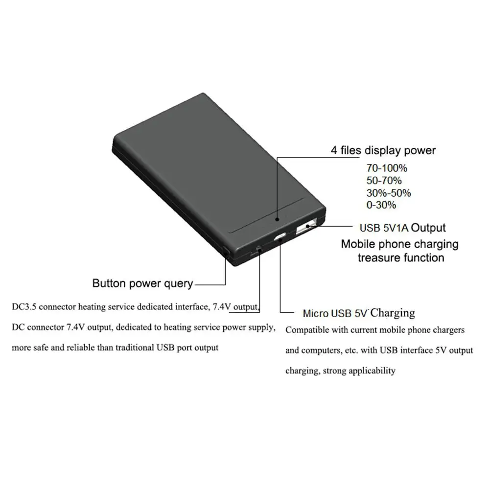 7.4V ce certified battery for instant heating, up to 8 hours of work, USB port for charging smartphones and other mobile devices.