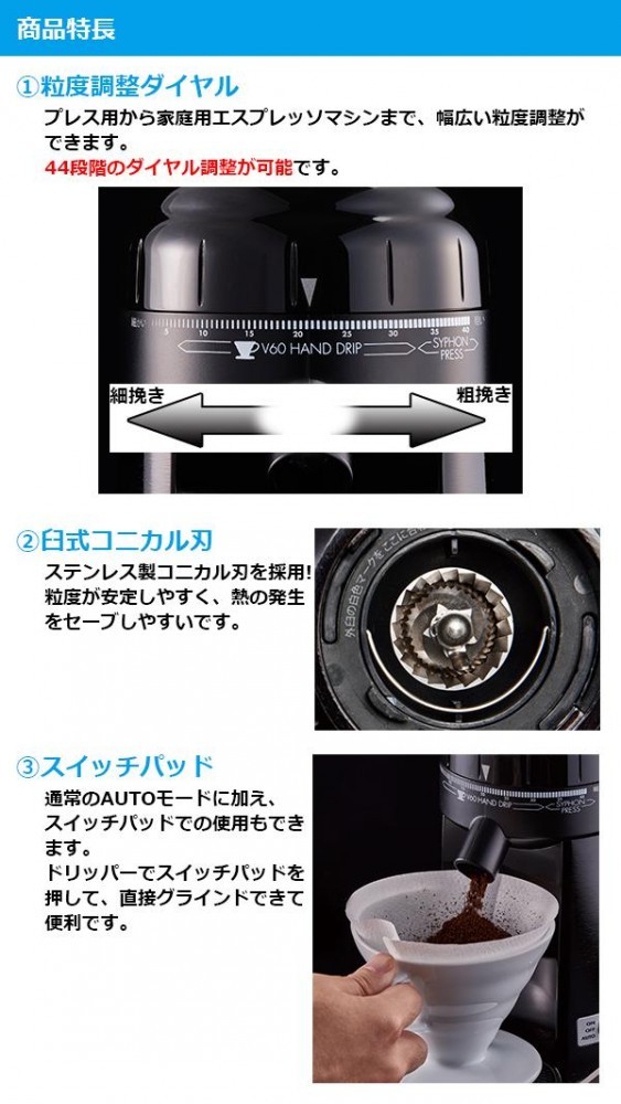 | サイフォン・プレス用から家庭用エスプレッソマシンまで、44段階の粗さ調節が可能な珈琲グラインダーです。 |