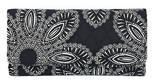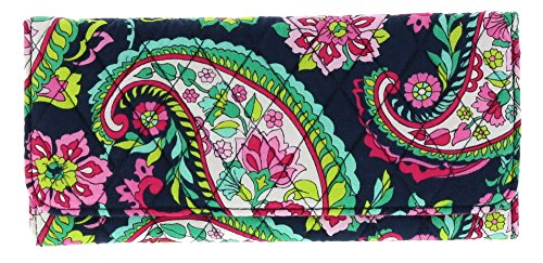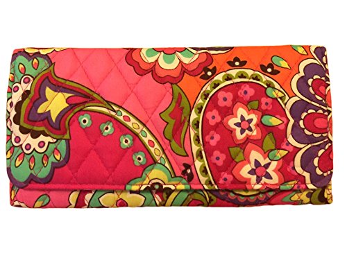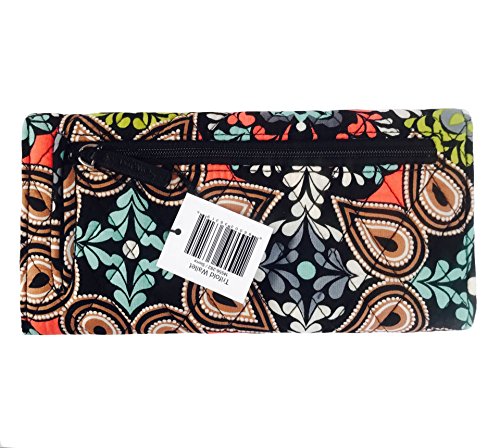 Vera Bradley's spacious Trifold Wallet is made of soft quilted fabric on the outside with a coordinating solid custom print logo fabric on the interiors. The interior features 11 card slots, 3 full length bill compartments and a clear ID window. The trifold style secures with two hidden magnet closures. The back offers an gusset zippered compartment. It measures approximately 8.5 inches (L) x 4.25 inches (H) x 1 inch (W). The location of pattern varies with each wallet. Spot clean with a damp cloth and mild soap.Feature