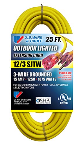 US Wire 74025 12/3 25-Foot SJTW Yellow Heavy Duty Lighted Plug Extension Cord
