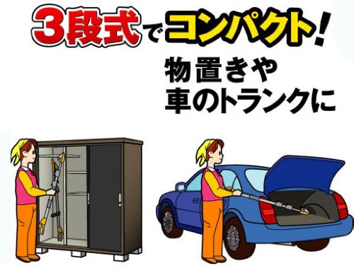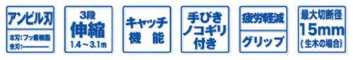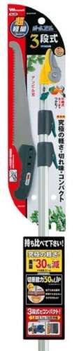 ● new revolution the ultimate lightness sharpness and compact. ● ultra-lightweight 3m type. ● compact three-stage expansion and contraction. ● straight cut anvil design. ● fatigue sponge grip. ● strong fluorine resin processing blade to rust and tar. ● The grasp branches and fruit that was cut. ● package size / Vertical: 1400mm Horizontal: 78mm height: 48mm ● Package weight: 1272g ● Material: pole: aluminum pipe cutting edge: fluorine resin processing anvil: fiberglass resin grip: sponge resin handle: aluminum die-cast catch: Glass fiber resin guide the saw blade section: high-carbon steel guide saw grip: ABS resin ● body size and weight: 1400 × 78 × 48mm ? 1000g ● stretch function: Min 1.4m ~ maximum 3.1m 18-stage ● maximum cutting Eda径(living tree-only): 15mm ● Note: please do not turn off other than living trees because living trees only. Please do not use in the vicinity of the wire.
