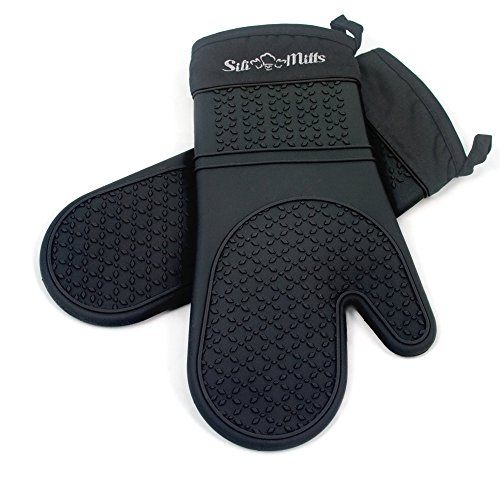 - LONG LENGTH & CONVENIENT - Long oven mitts to cover your arms - no burns off the racks . Can be used for basting on the barbecue - no heat burn. Fits comfortably on male and female hands. Loops to hang or put in a drawer.