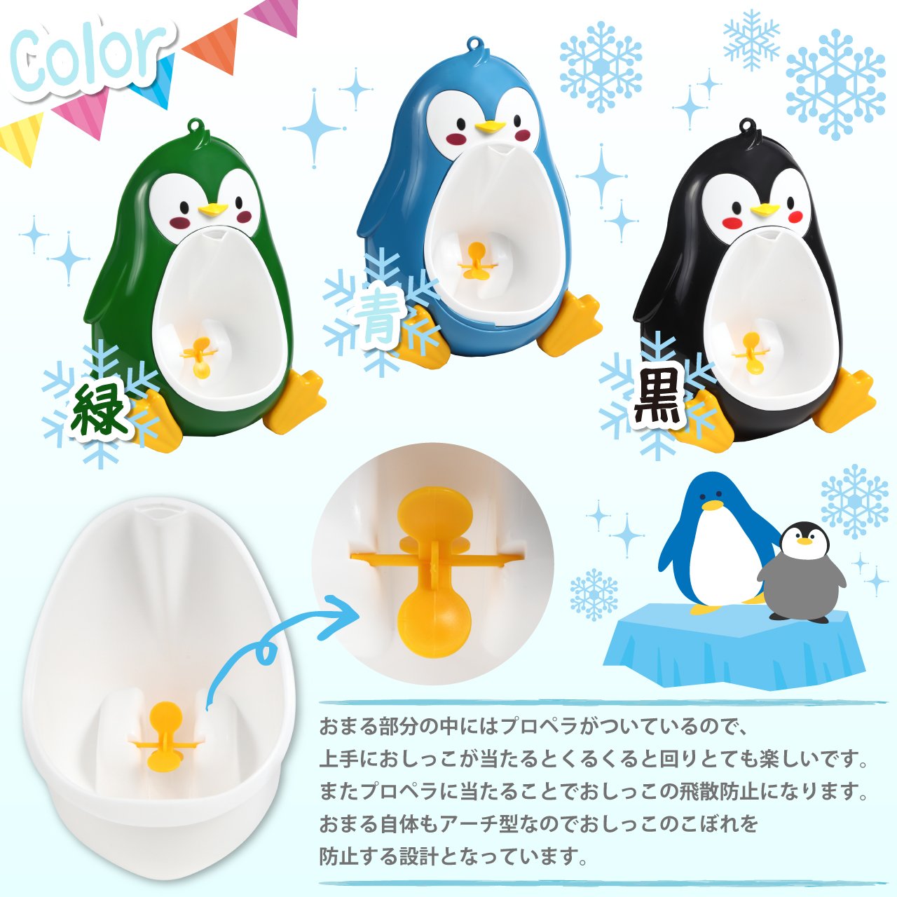 It is a very cute penguin type playfully loaded boy's practice toilet (auxiliary toilet seat / urinal).