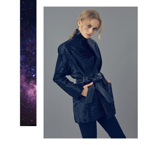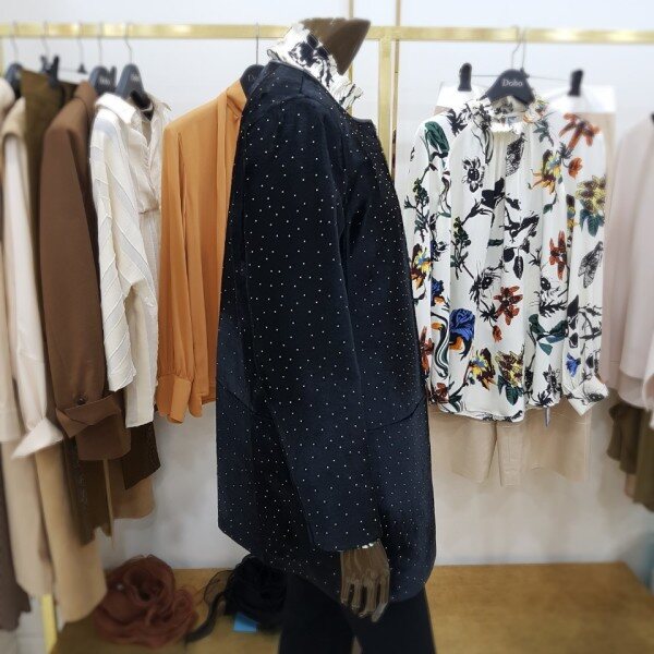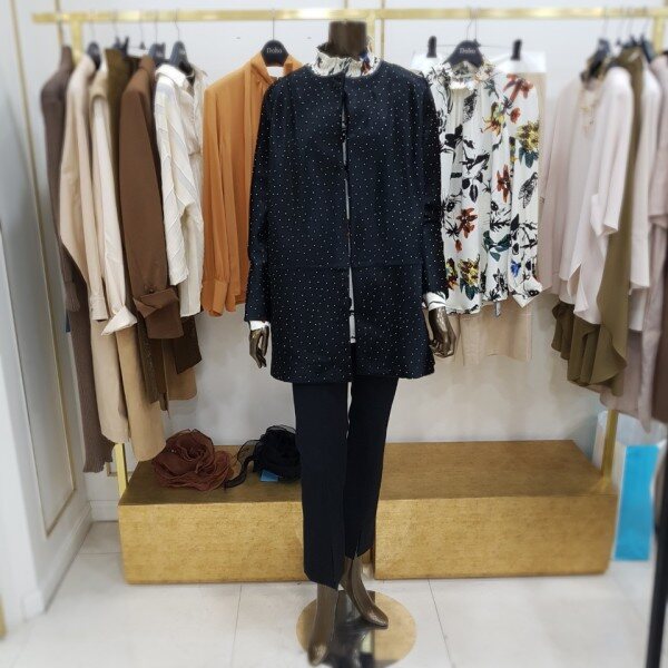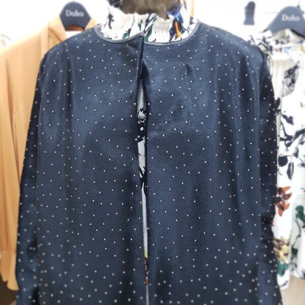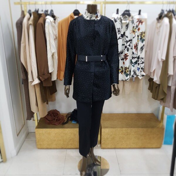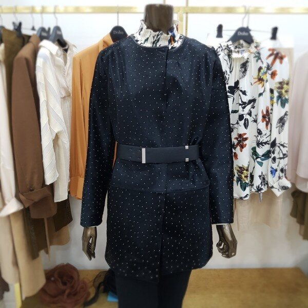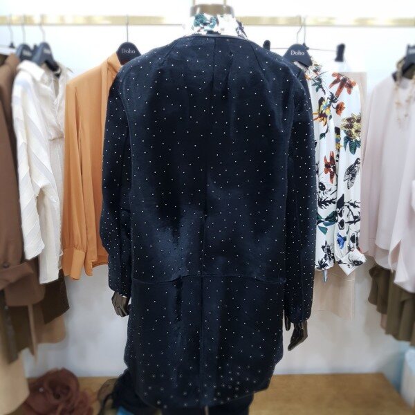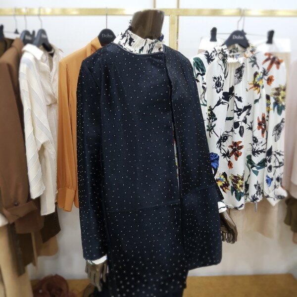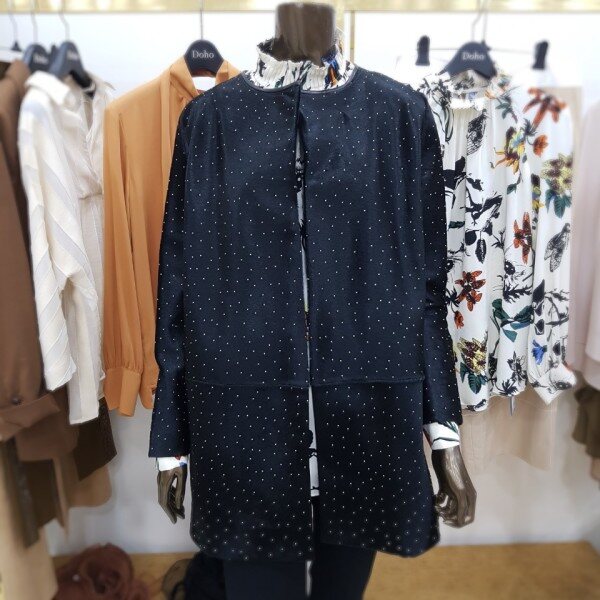 일자로 떨어지는 박시한 핏의 하프 자켓으로 결이 고운 고급 블랙 송치에 작은 스터드가 박혀있는 것이 특징입니다 차별화된 소재 자체로 특별함을 줄 수 있는 유니크한 아이템 입니다