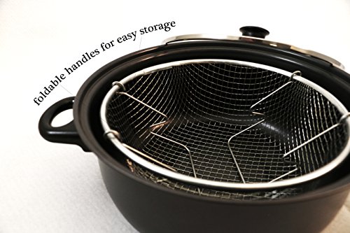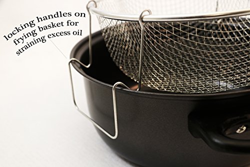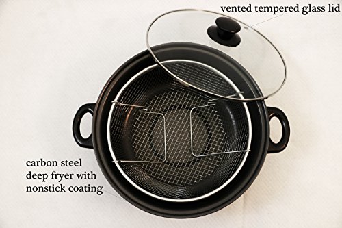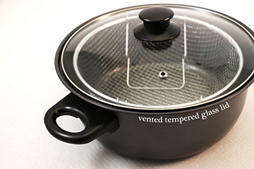 Constructed in long lasting carbon steel, this 11.5" fryer comes with a nonstick coating makiing it easy to clean up. Also designed with a large handle for easy usage. The Glass tempered lid allows you to monitor your cooking while the stay cool Bakelite handle and knob provides comfortable use.Feature