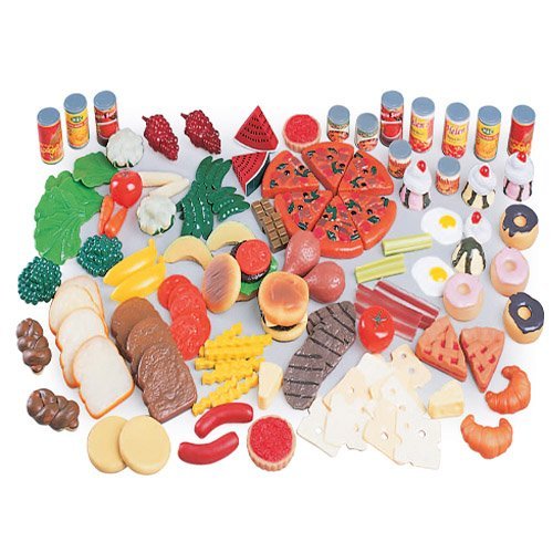 -. Feature : 130 piece set / Includes Toy Fruits, Toy Veggies, Toy Meats, Toy Breads, Pastries, Ice Cream, and many more! / Items are small but the perfect size for little hands: canned goods measure 2" tall, egg measures 2" in diameter, donut measures 2" in diameter / Pretend food made of durable plastic / Ages 3 yrs.+