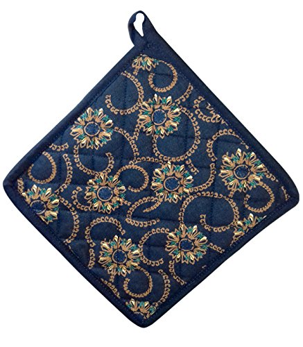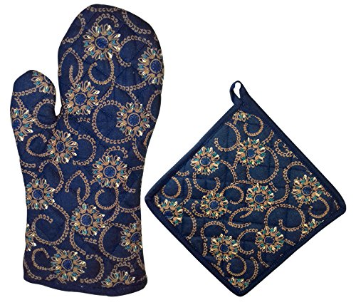 Miyanbazaz Textiles Heat Resistant 100 % Cotton Navy Blue Designer Oven Mitt 13 x 6.5" and Pot Holder 8 x 8" Kitchen Gift Set