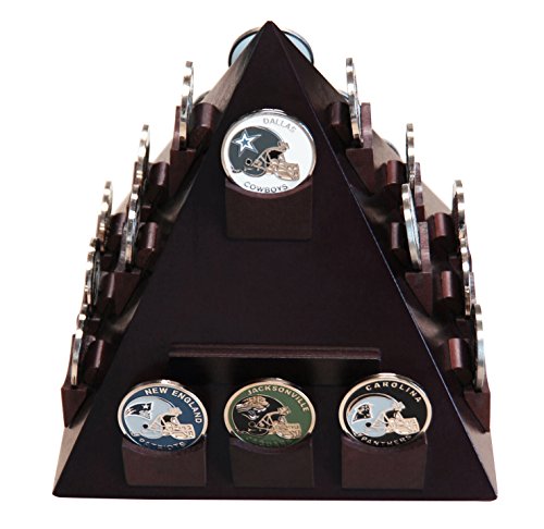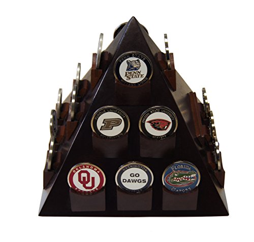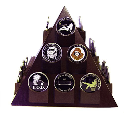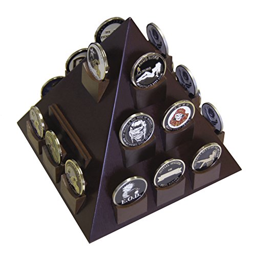 - DECOMIL - Pyramid Shaped Military Challenge Coin & Poker/Casino Chip Display Cherry Color with Rotatable Base holds the standard or differene shape 22 Coins proudly all your treasured awards and memorabilia. You can also display name plate or your business card on beaitufully in your office table or at home.