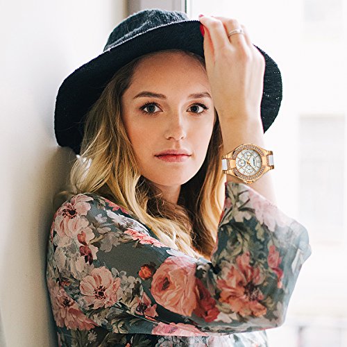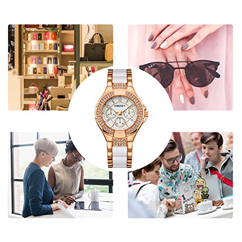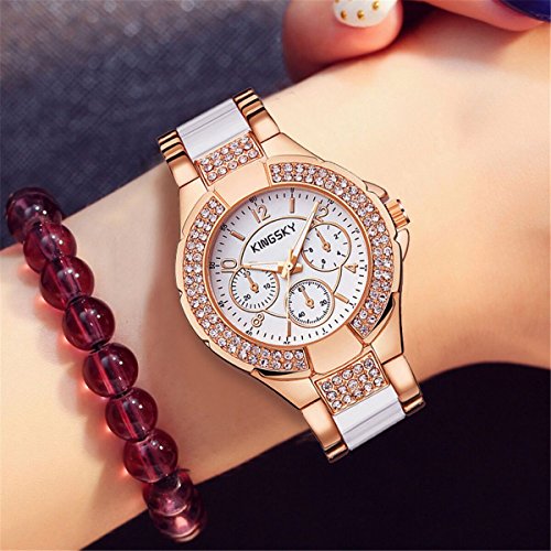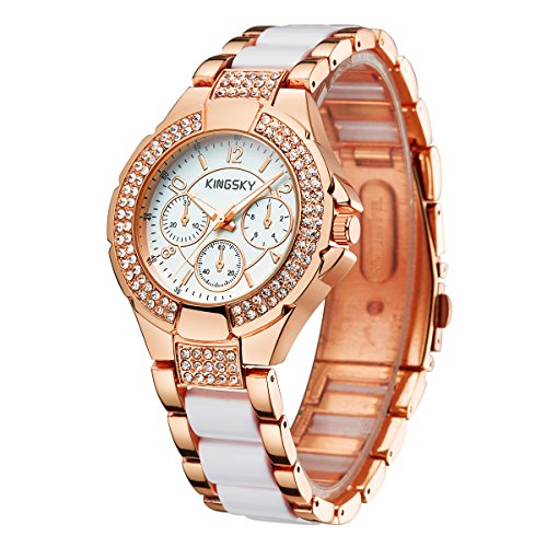 Women Gold Watches KINGSKY Brand Rhinestone Band Japan Quartz Movement Fashion Ladies Wrist Watch 011011 (Rose Gold White)