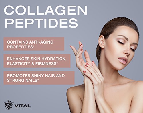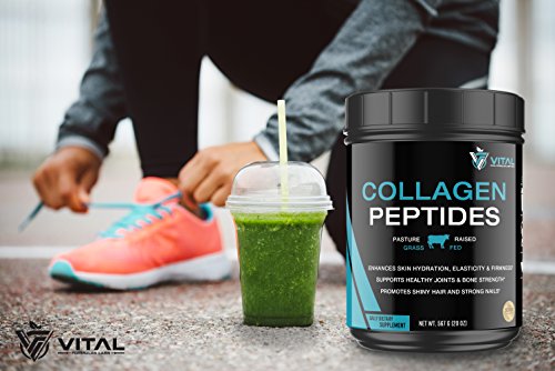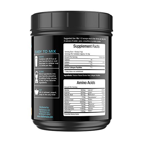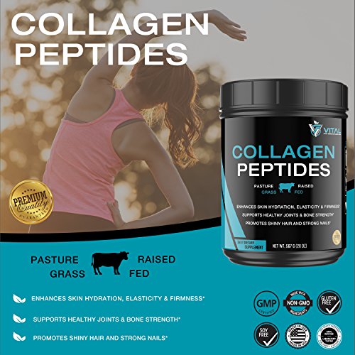 -. Feature : PREMIUM QUALITY: Made from 100% Pure Hydrolyzed Bovine Collagen Peptides sourced from grass fed, pasture raised cows. Supports Type I and II Collagen. Contains 11 Grams of Premium Collagen + 18 Grams of Vital Proteins per Serving & Loaded with 18 Essential Amino Acids. Best collagen supplement available - 25% more Collagen than other brands (1.25 lbs.)! / HAIR, SKIN & NAILS: Collagen is a vital nutrient to enhance skin hydration, elasticity and firmness along with promoting shiny hair and strong nails. Known to fight against wrinkles and unwanted lines. Promotes glowing, youthful-looking skin / BONES AND JOINTS: Supports healthy joints and bone strength. Helps to rebuild bone density, promote healthier cartilage and helps to relief joint pains / DETOX: Improves digestive health, boosts metabolism and helps to cleanse and detox liver. Supports weight loss / EASY TO MIX: 3 easy ways to get your daily collagen protein - Combine with your favorite hot or cool beverage; Blend into your favorite smoothie; Mix into a meal (e.g., yogurt, oatmeal, soup, etc.)