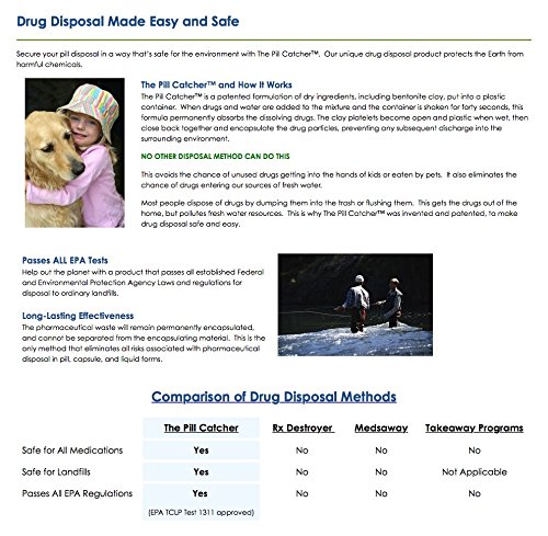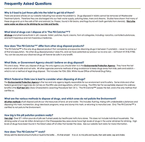 Studio : Pill Catcher Publisher : Pill Catcher Binding : Health and Beauty Product Description The Pill Catcher is a new, easy-to-use product that allows you to dispose of pills and liquid medicines safely. The Pill Catcher is a patented formulation of dry ingredients, including bentonite clay, put into a plastic container. When drugs and water are added to the mixture and the container is shaken for forty seconds, this formula permanently absorbs the dissolving drugs. The clay platelets become open and plastic when wet, then close back together and encapsulate the drug particles, preventing any subsequent discharge into the surrounding environment. We certify that The Pill Catcher is the only drug disposal product that passes all EPA tests for safe disposal to landfills. The Pill Catcher Gallon bottle can accommodate up to 2,500 c.c.'s of liquid drugs, or 1,500 pills of any type or class. 0