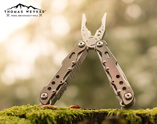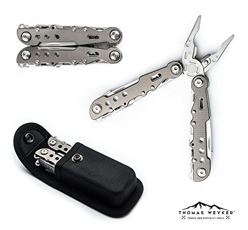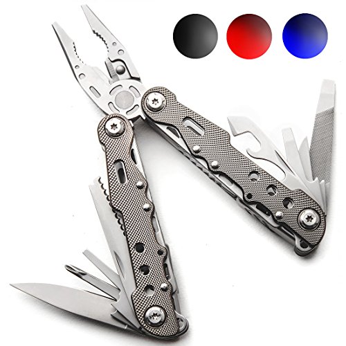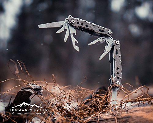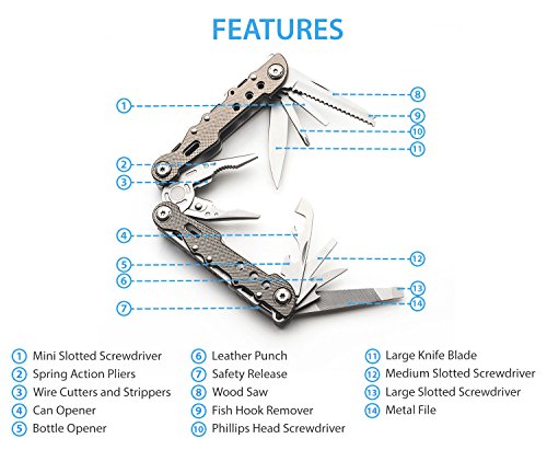 ✅ IMPRESSIVE NUMBER OF TOOLS – This marvellous portable tool comprises of the 14 most useful everyday tools: internally reinforced spring action pliers, wire cutters, wire stripper, can opener, bottle opener, mini, medium and large slotted screwdrivers, Phillips head screwdriver, a large knife blade, leather punch, metal file, a saw with fish hook remover and a safe locking mechanism.