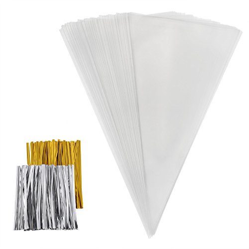 Outus 100 Pieces Cone Bags Clear Cello Bags Treat Bags with 50 Gold and 50 Silver Twist Ties for Sweets, Crafts, 11.8 by 6.3 Inches