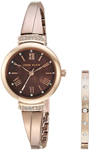 Rose gold-tone case and lugs set with swarovski crystals; brown mother-of-pearl dial with rose gold-tone hands and swarovski crystal accented markers