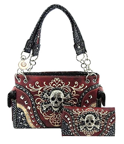 -. Brand : Western LuxeBag -. Department : womens -. Feature : Western skull handbag and wallet set, plus LB key chain / Faux leather and top zip closure / Handbag size : 13(L) by 8(H) by 5(W) inches (drop length 10 inches) / Concealed gun case size : 9(L) x 5(H) inches / More details in the description -. Model : WGSK939W22-SET -. NumberOfItems : 2 -. PackageQuantity : 2 -. ProductGroup : Shoes -. ProductTypeName : HANDBAG -. Size : Medium -. Title : Western Skull Purse and Wallet Set with Metal Skull