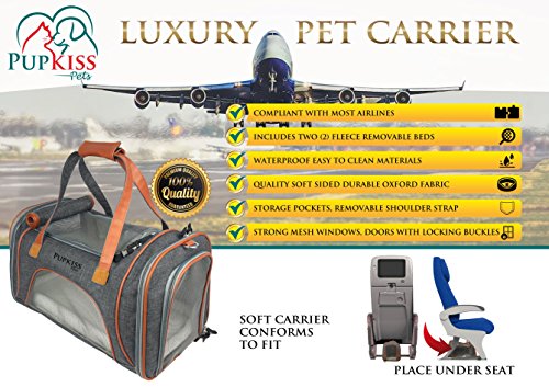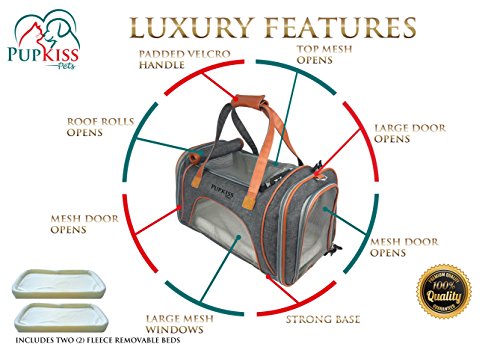 NO NEED TO LEAVE YOUR PET AT HOME, THEY CAN TRAVEL IN LUXURY! We have 2?FLEECE BEDS INCLUDED ?for your convenience and cleaning (dry clean suggested). Fleece is easy to remove and secures with velcro. Extra strong base keeps your pet sturdy and safe. High quality durable oxford non stain material allows for easy cleaning inside and out. Roof top can be open or closed. Both sides and top open for easy access. Heavy duty mesh offers plenty of ventilation.? FEATURES AND BENEFITS - Accommodates Most Airline Requirements.