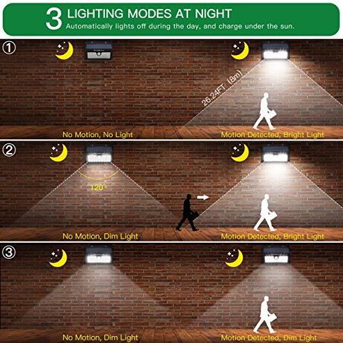 - 3 Optional Modes: In the daytime, the lights will automatically turn off and charge under the sun, while there are 3 modes to choose at night. Bright light sensor mode, dim/bright light sensor mode, dim lights mode, different mode could meet different need, perfect to be used in the garden, patio, backyard, driveway, path, garage, entrances, step, porch, fence and anywhere need great motion sensor light.