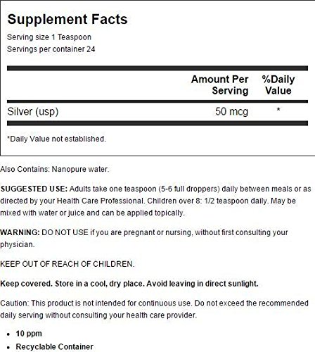 Earth's Bounty Colloidal Silver Description: Earth's Bounty Colloidal Silver is all natural, and 99.99% pure. It is made using a unique electrosonic process that yields true colloidal particles that are more stable and in the desirable 1-9 nanometer range (.001 - 0.009 microns). Disclaimer These statements have not been evaluated by the FDA. These products are not intended to diagnose, treat, cure, or prevent any disease.Feature