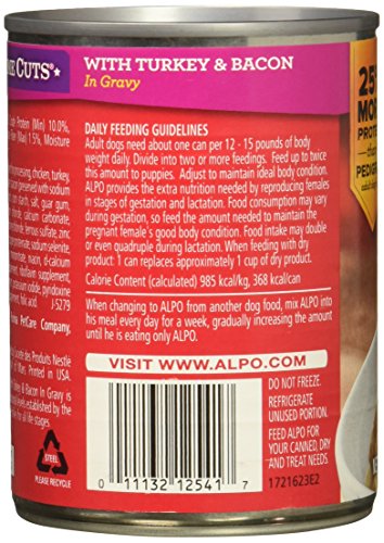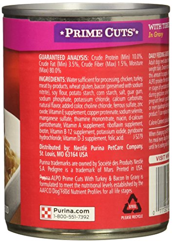 -. Feature : Purina Alpo Prime Cuts In Gravy Home-style with Turkey & Bacon Dog Food. Tender, meaty bites. 100% complete & balanced / Guaranteed Analysis: Crude Protein (Min) 10%. Crude Fat (Min) 3.5%. Crude Fiber (Max) 1.5%. Moisture (Max) 80.0%. Purina Alpo Prime Cuts In Gravy Home-style With Turkey & Bacon